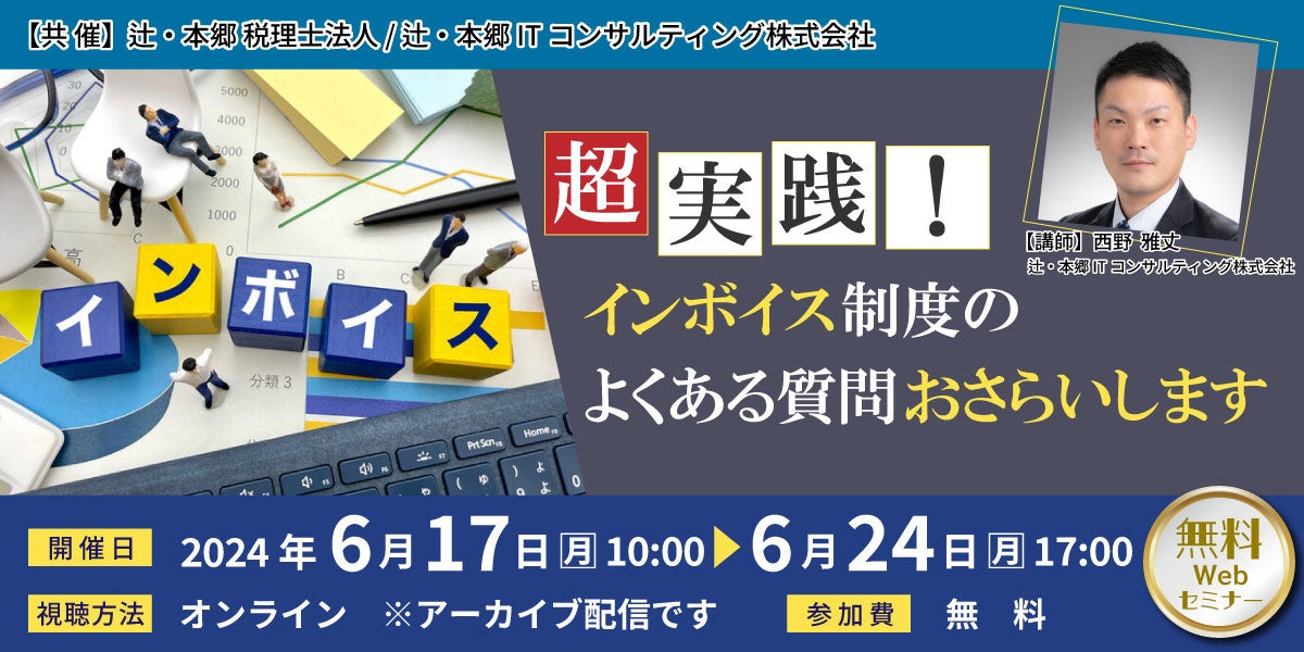 インボイス制度対応、自社の対応は合っている?そんなお悩みを持つ方に向けたセミナー「超実践!インボイス制度のよくある質問おさらいします」を6/17~6/24の期間中にオンラインで無料開催