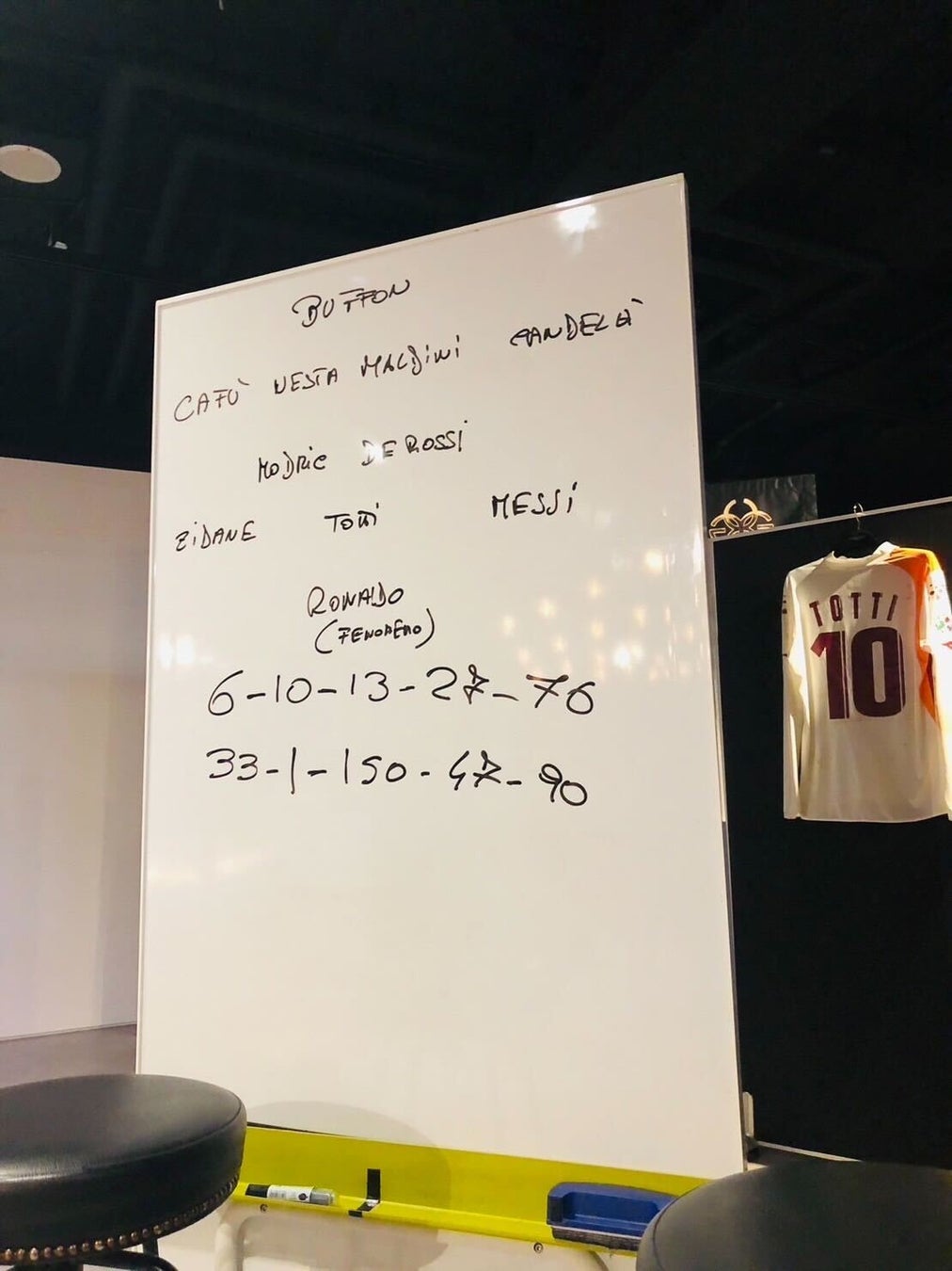 トークセッションの中で、参加者から「トッティ氏が選ぶ歴代ベストイレブン」の質問が投げかけられたことで、ご本人自らホワイトボードを活用しながら「このメンバーなら監督がいなくてもコパ・アメリカはすぐに優勝できそうだね」と笑顔でご自身が選ぶ歴代ベストイレブンをお答えいただき、当日のスペシャルゲストを含め、参加者は普段お聞きすることができない内容に大興奮の様子でした。