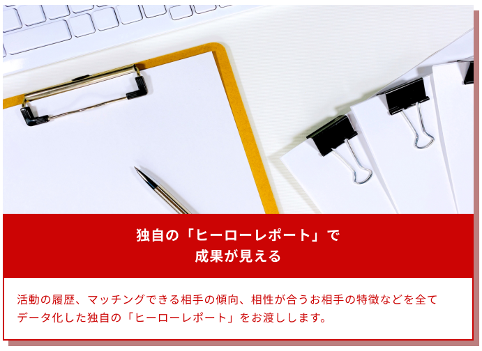活動の履歴、マッチングできるお相手の傾向、相性が合うお相手の特徴などを全てデータ化した独自の「ヒーローレポート」をお渡しします。自分自身の成果を定量的に見ることで、成婚までのスピードを加速させることにつながります。