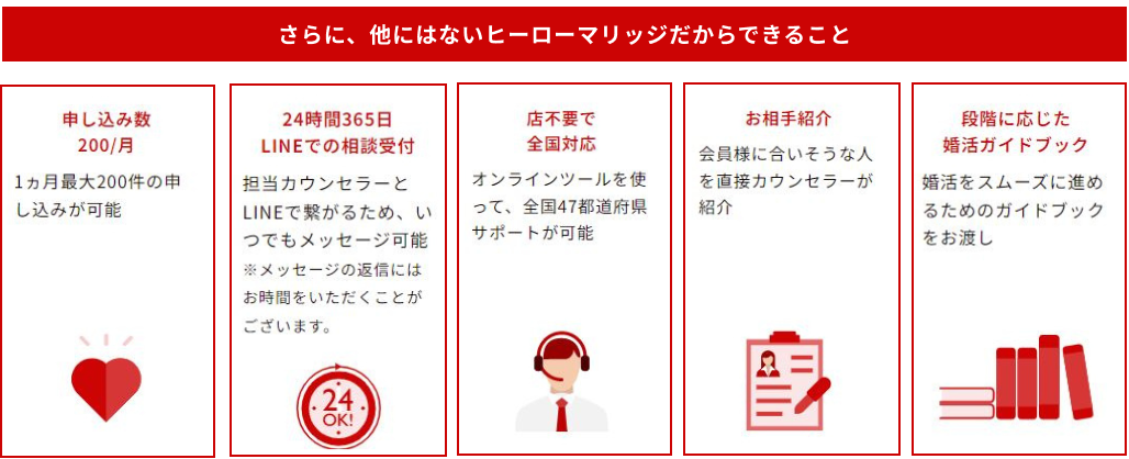 「ヒーローマリッジ」はオンラインツールを用いたカウンセリングにより、全国47都道府県の会員様をサポートします。入会後は担当アドバイザーがプロフィールの文章作成をサポートし、婚活をスムーズに進めるためのガイドブックをお渡しします。会員様に合いそうなお相手を担当アドバイザーが直接紹介するだけでなく、月に最大200件お見合いの申し込みが可能です。