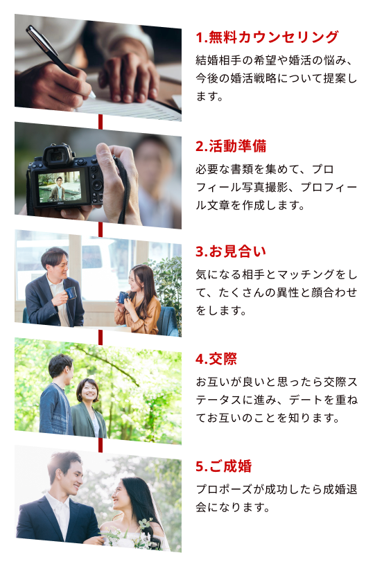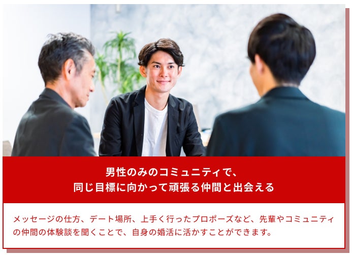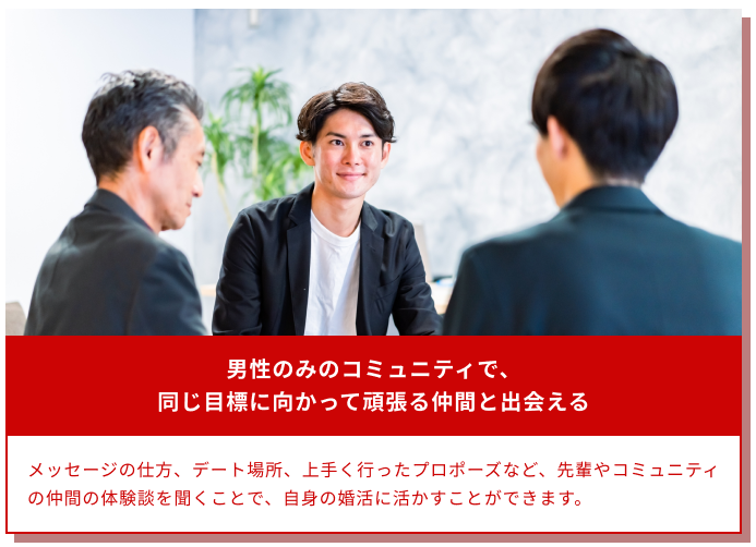 同じ目標に向かって頑張る仲間と出会うことができる男性会員様のコミュニティをご用意しています。メッセージの仕方、デート場所、上手く行ったプロポーズなど、先輩やコミュニティの仲間の体験談を聞くことで、自分自身の婚活に活かすことができます。定期的に交流会も開いているので、息抜きとして利用するのもおすすめです。