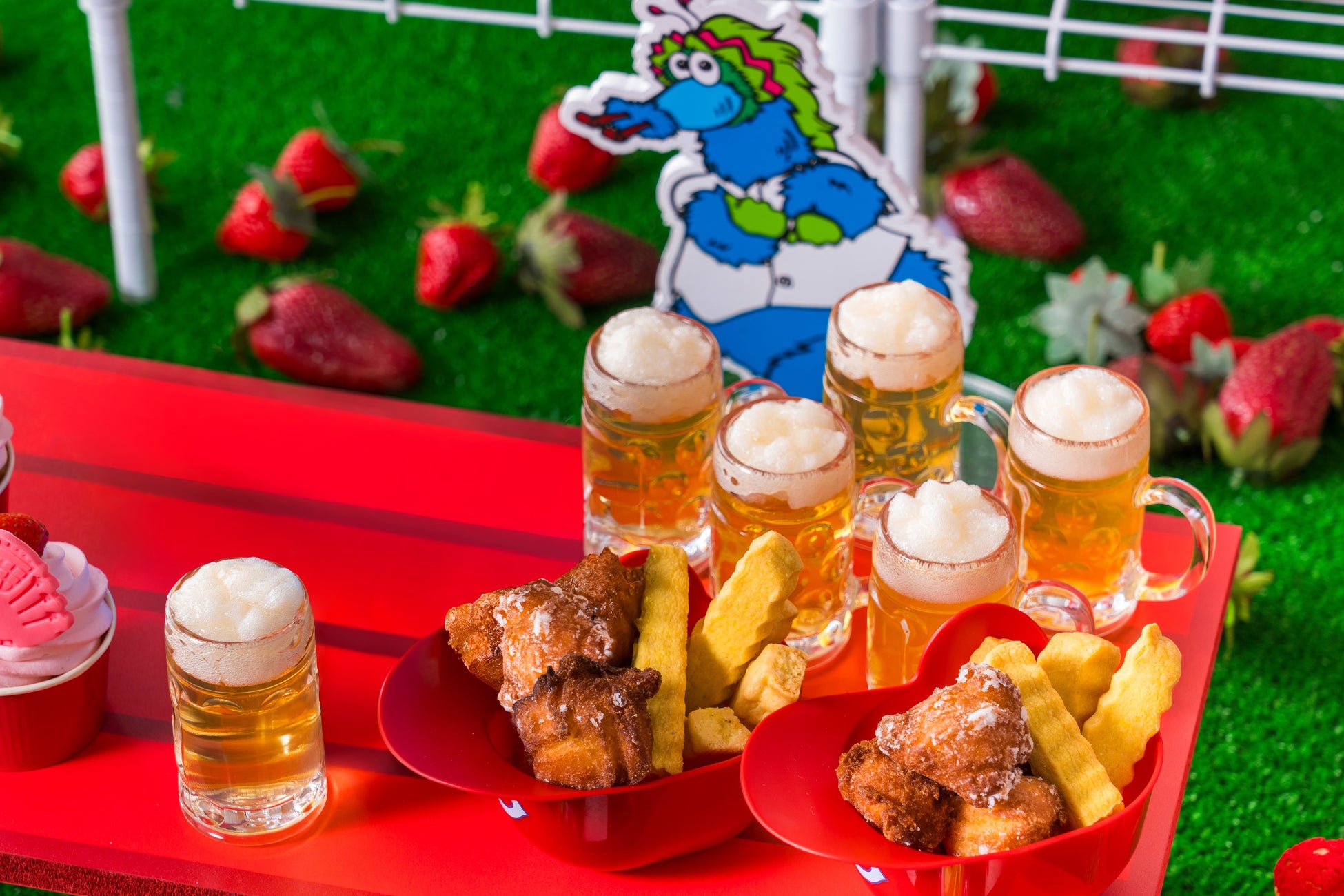 また、出来立てのスイーツをご用意するライブステーションでは、球場での観戦に欠かせない生ビールとおつまみを再現した「休日のスラィリーセット」も登場!泡まで本物そっくりの生ビールはりんごゼリー、フライドポテトはバニラクッキー、唐揚げは甘い生地にほんのりと塩味を効かせたドーナツで出来ています。その他にも定番のチョコレートファウンテンやアイスクリーム、たっぷりのフレッシュ苺もお好きなだけ!カープの世界観と苺に囲まれる至福の時間をお過ごしいただけます。