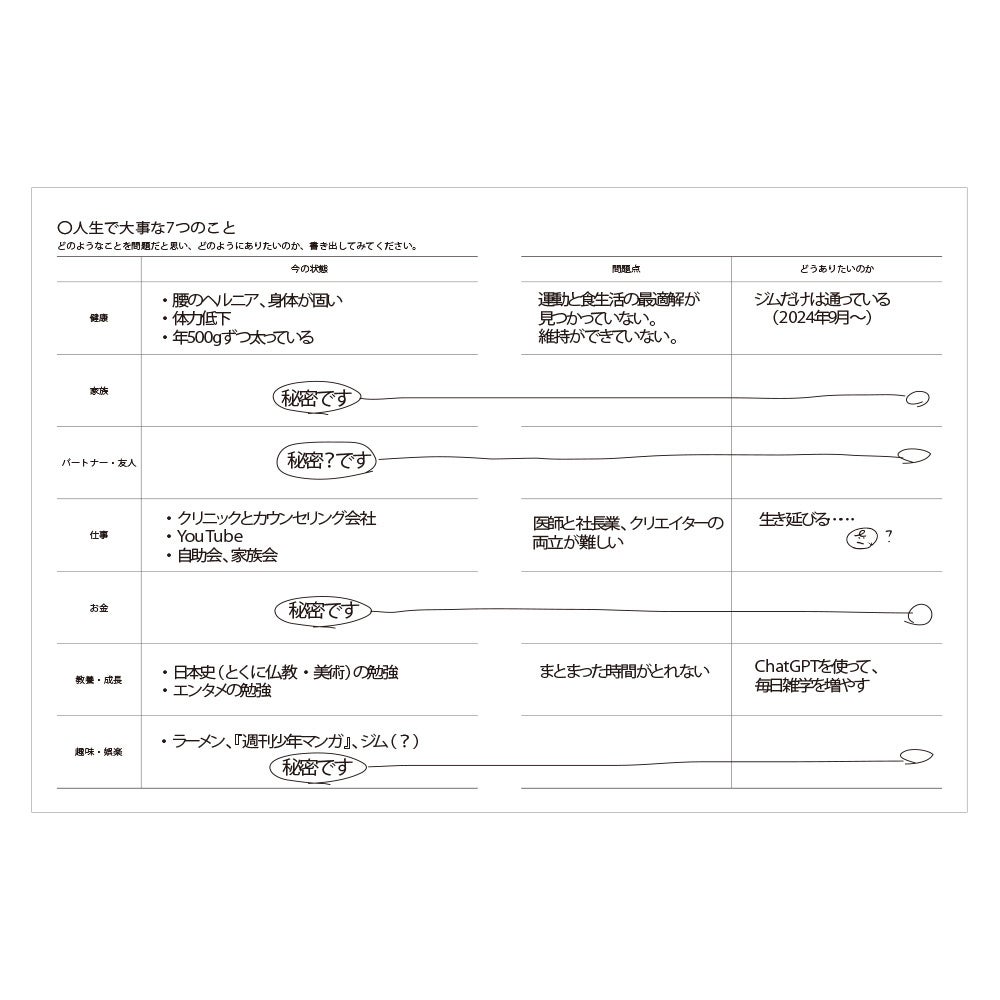 手帳の後半には、気持ちや考えを整理するためのワークブックが付いています。YouTube動画でも話題にでてくる「人生で大事な7つのこと」「不安階層表」「生い立ち」「自己理解ワーク」などのワークも充実しています。