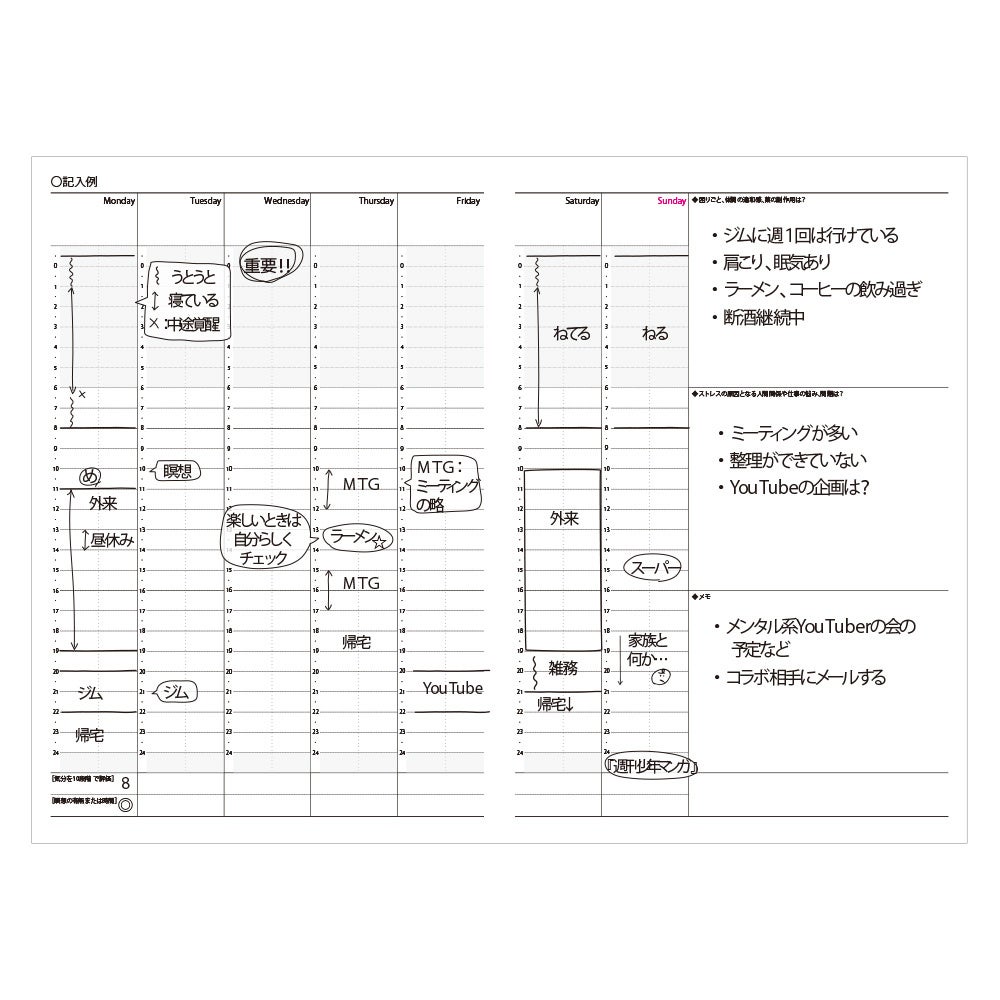 24時間の行動を記録できるバーチカルレイアウトを採用し、睡眠時間や生活リズム、体調の変化や悩み事を可視化できます。