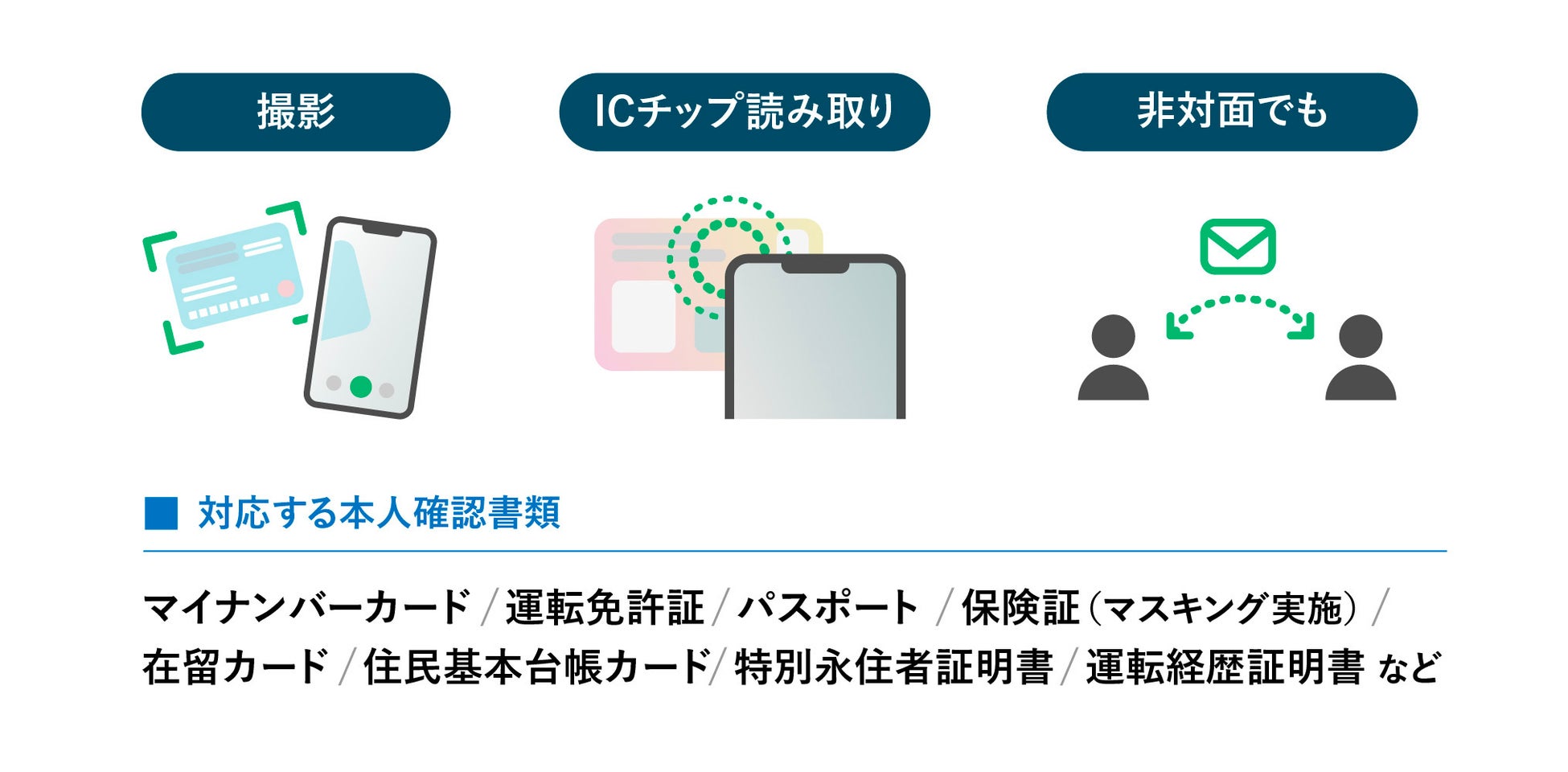 身分証データの取得方法について、画像撮影、マイナンバーカードのICチップ読取による方法に加えて、メールでリンクを送付しご自宅等でお客様ご自身のスマホ等で画像撮影を行う方法(eKYC・非対面)も選択が可能です。マイナンバーカード、運転免許証、パスポート、保険証(マスキング実施)、在留カード、住民基本台帳、特別永住者証明書、運転経歴証明書、などの主要な身分証に対応するほか、記載以外の身分証や、法人や代理人の本人確認を行うケースにも対応しております。