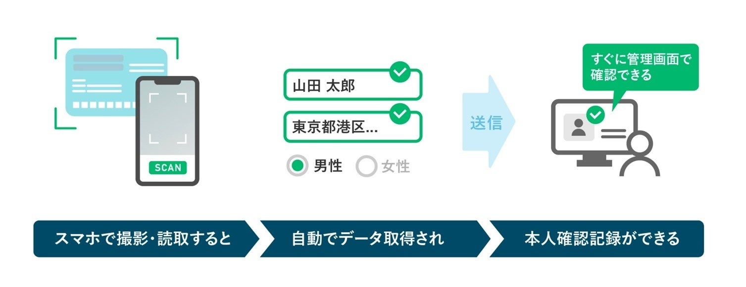 スマートフォンやタブレットを使って身分証の撮影・読取をするだけで、本人確認データを自動で取得することができ、取得した情報は本人確認記録としてクラウド上に安全に保管されます。これにより、これまでの不動産取引フローを変えることなく、コピー・スキャン・マスキングなどアナログ対応だったものを簡単にデジタル化することができます。営業現場はスマホやタブレット一台で作業を完結し、管理部門は取得データを瞬時に管理画面で確認可能となるため、営業部と管理部の部門間のタイムラグや手間が解消され、効率的な本人確認プロセスが実現します。さらに、犯罪収益移転防止法に準拠した本人確認記録が自動生成されるため、コンプライアンスも確保されます。