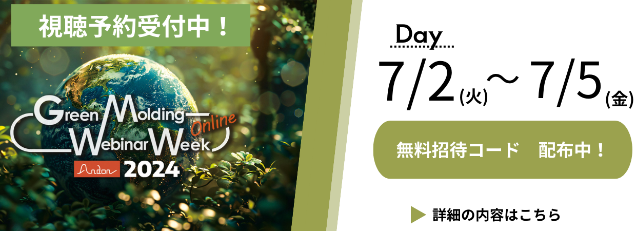 より少ない資源で、より多くの量と大きな付加価値を生み出す「グリーンモールディング」。当ウェビナーイベントでは、プラスチック成形に関わる27社が、成形工場に欠かせない革命的な商品や技術を紹介する55のウェビナーを開催します。