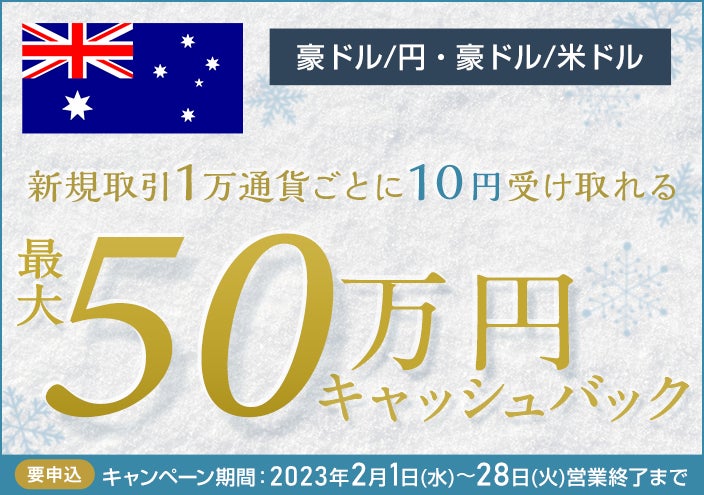 セントラル短資FX株式会社(本社:東京都中央区、代表取締役社長:松田 邦夫)は、2023年2月28日まで豪ドル/円と豪ドル/米ドルの新規取引を対象としたキャッシュバックキャンペーンを実施します。