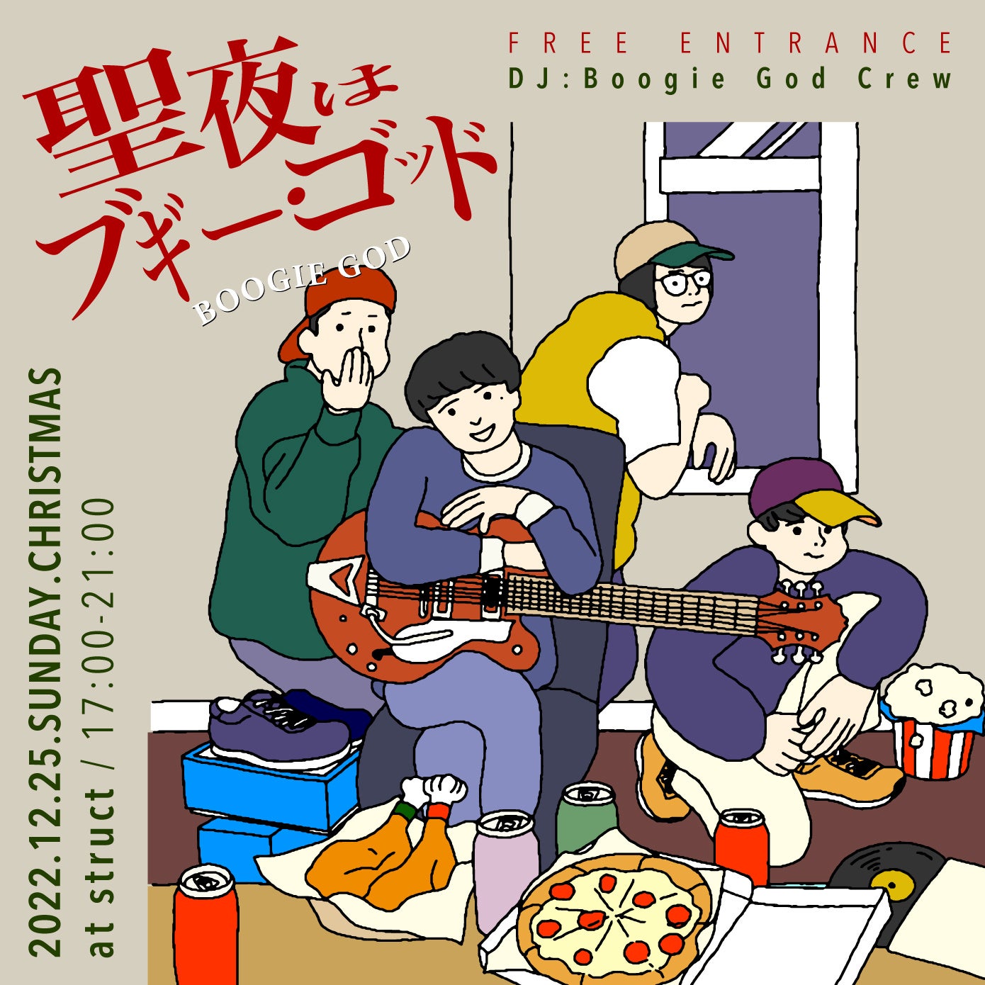 店内では初となるDJイベント。主宰のハラダ(ストラクト店主)が「この時、このメンツ、このやり方、この音がいい」と企画。選んだのは、どんな場所でも誰でもlockしてしまうDJクルーBoogie Godに協力を依頼。当日は営業中の店内を、華やかな光のダンスフロアーへ誘うライブDJを行う。入場無料なので12月25日のクリスマス、気軽に立ち寄れて、楽しめるイベントになっているので是非足をお運びください。