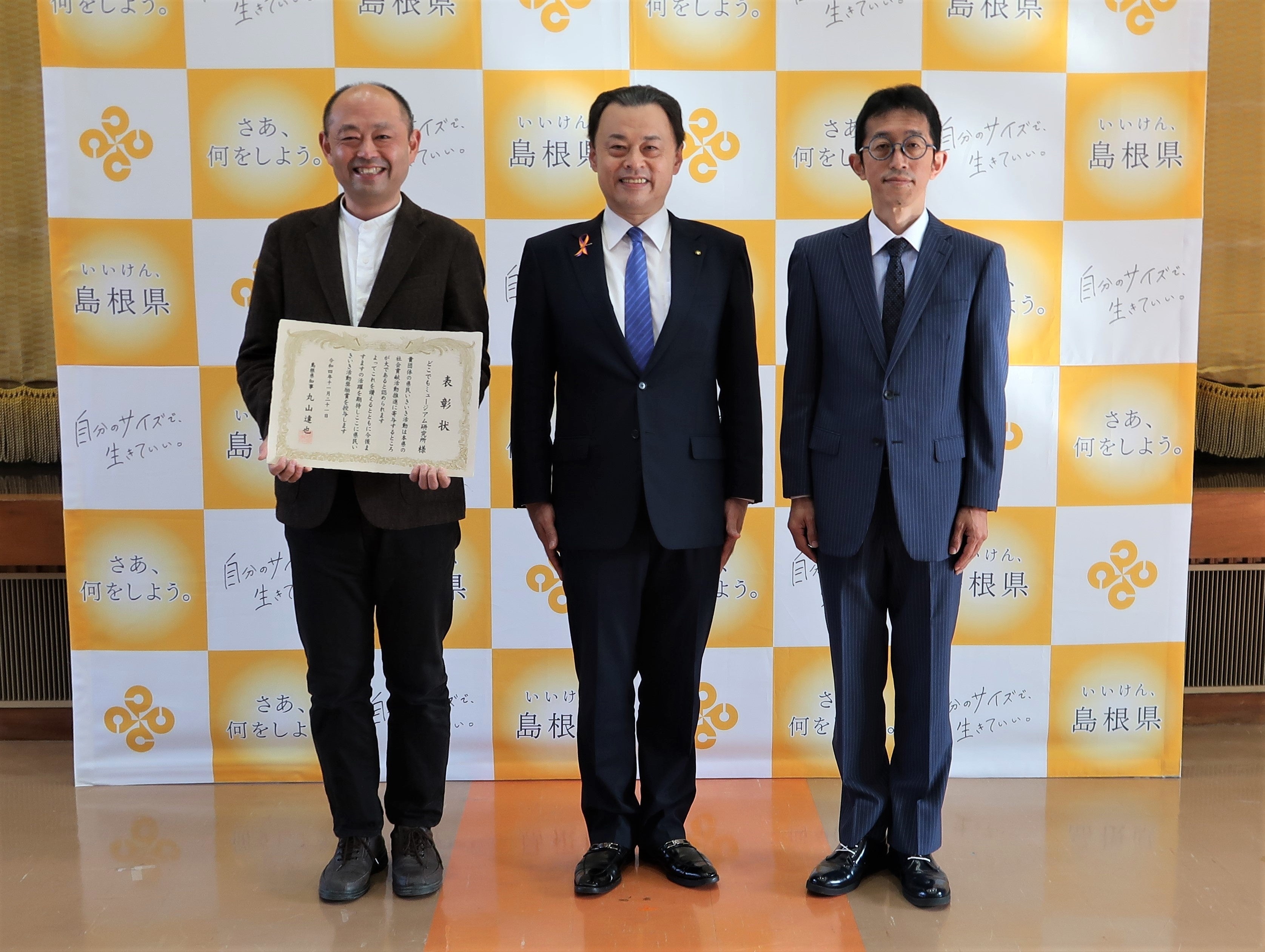 2022年11月21日、島根県庁で表彰式が行われました。表彰式には「どこでもミュージアム研究所」代表の高嶋敏展氏(学外の写真家・写真左)と、事務局長である福井一尊准教授(写真右)が出席し、丸山達也 島根県知事(写真中央)から表彰状を授与されました。