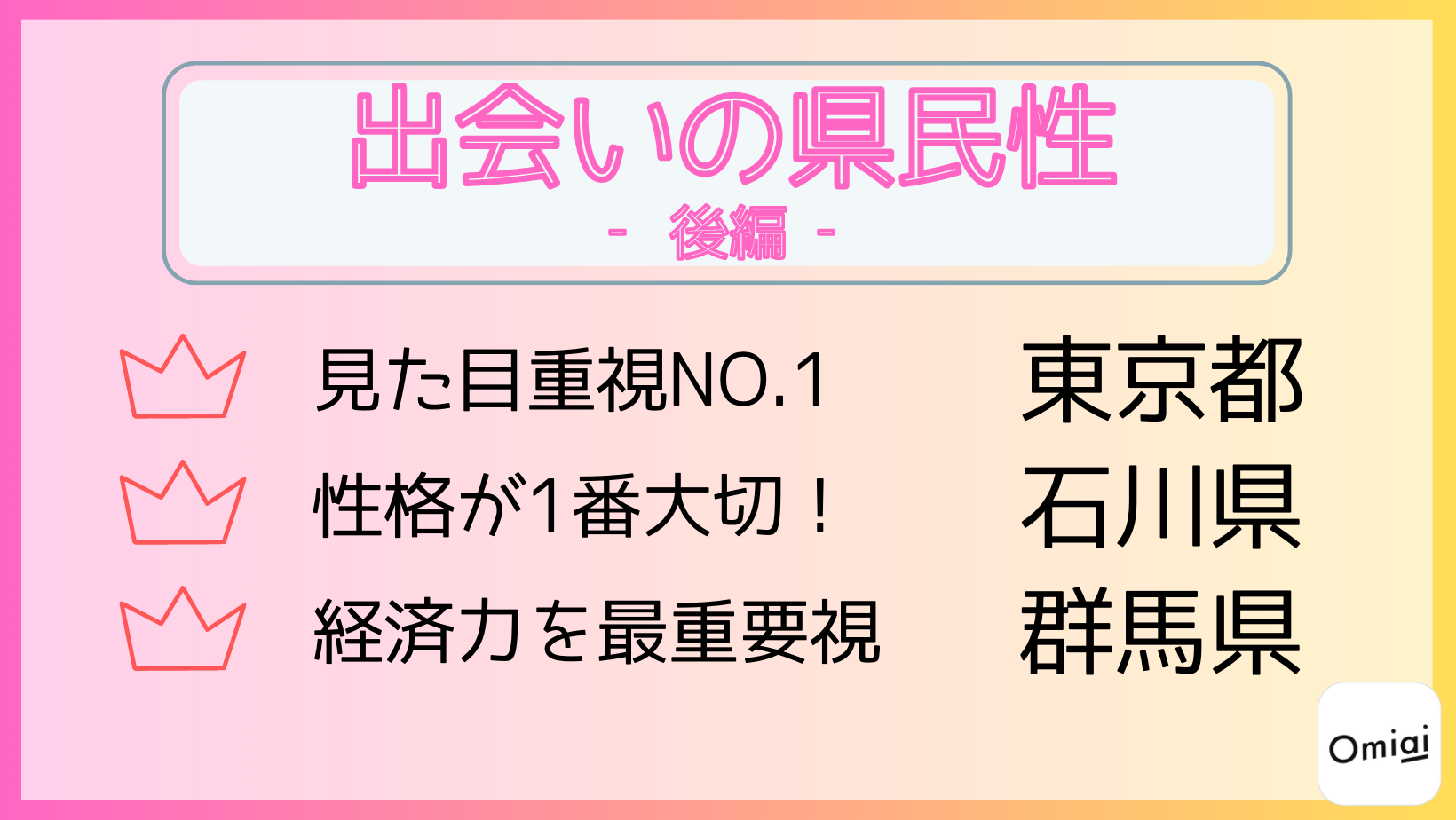『2023年最新版!出会いの県民性』と題し、全国20~39歳の男女2,802名を対象とした「恋愛に関する、スタンスや振る舞いについて」のアンケート調査から、県別ランキング*を作成いたしました。前編では「恋愛への積極性」「交際人数のランキング」をお送りしましたが、後編では「見た目と中身」「お金と愛」など究極の選択的なデータとランキングをお届けします。