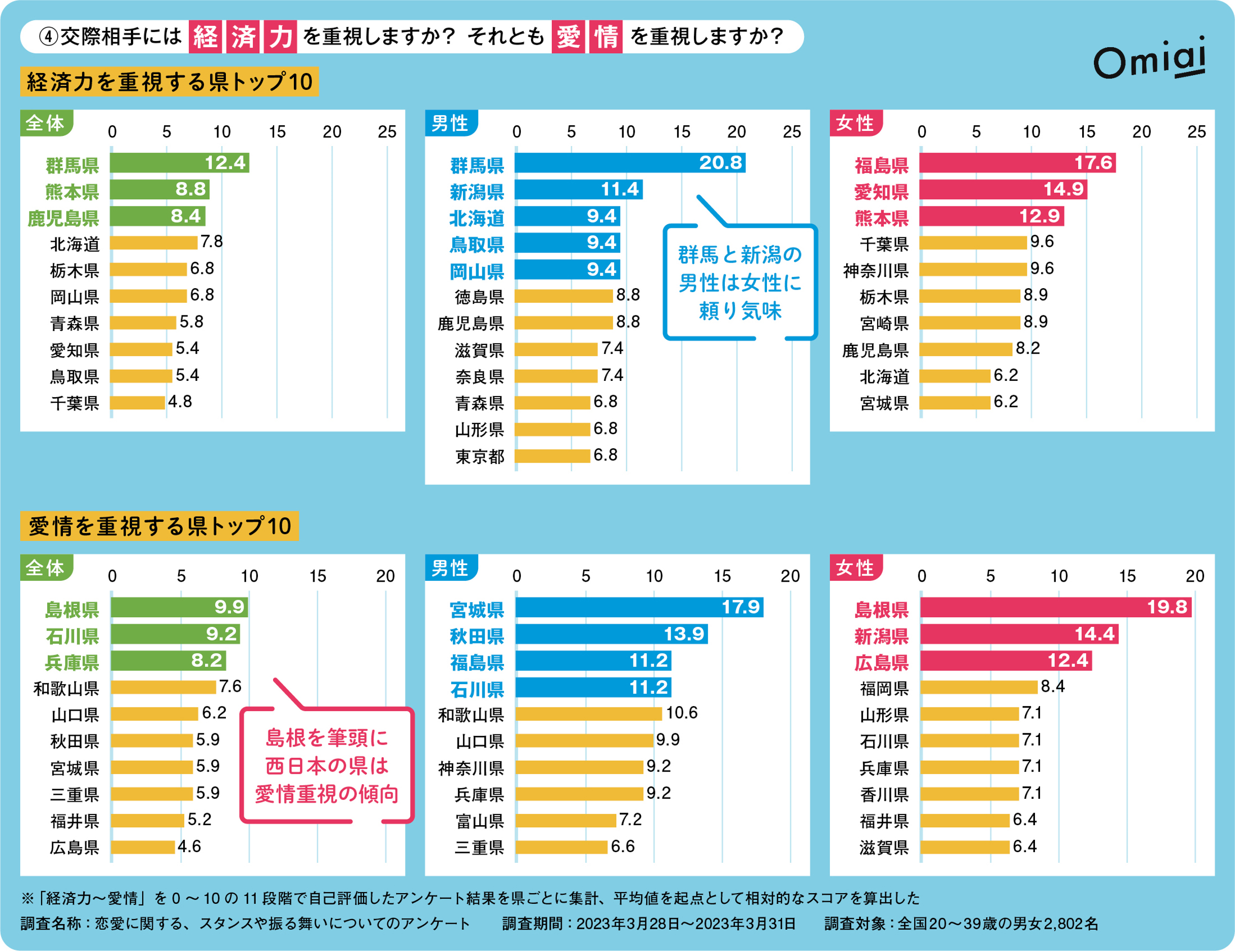 また、福島県と新潟県は男女で価値観の違いが浮き彫りになりました。福島県の女性は経済力を重視する一方で、男性は愛情を重視する傾向に。新潟県の男女では、その逆の現象が起きています。県民性による男女間のギャップも興味深いデータです。