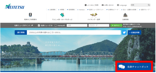 (1)当社ホームページ(https://top.meitetsu.co.jp/)よりチャットボットへアクセス