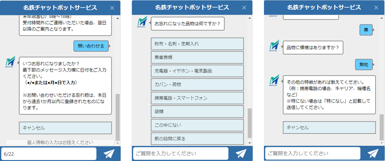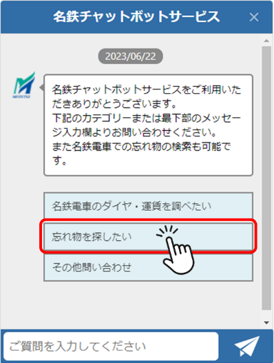 当社ホームページのチャットボットに、新たに遺失物に関する検索ができる機能を持たせ、お客さま自身でいつでも(24時間365日)、どこでも(スマートフォン・パソコンから)遺失物を探すことが可能となります。チャットボットが遺失物の特徴をヒアリングし、該当する遺失物が当社に保管されているかを確認できます。(該当有りとなった場合、「名鉄お客さまセンタ―」にご連絡いただき、最終確認を行います。)