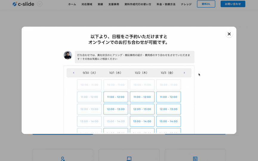formmateは、資料請求後すぐに担当者の空き日程を提示し、ユーザーはその場で商談予約まで完了できます。