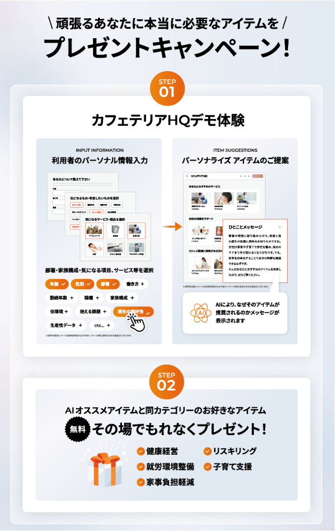 また、デモを体験いただいた方に、スキルアップやリスキリングに役立つビジネスグッズ、美容健康グッズ、家事時短グッズなど、AIが薦めるアイテム・サービスと同じカテゴリーのアイテムをその場でプレゼントいたします。