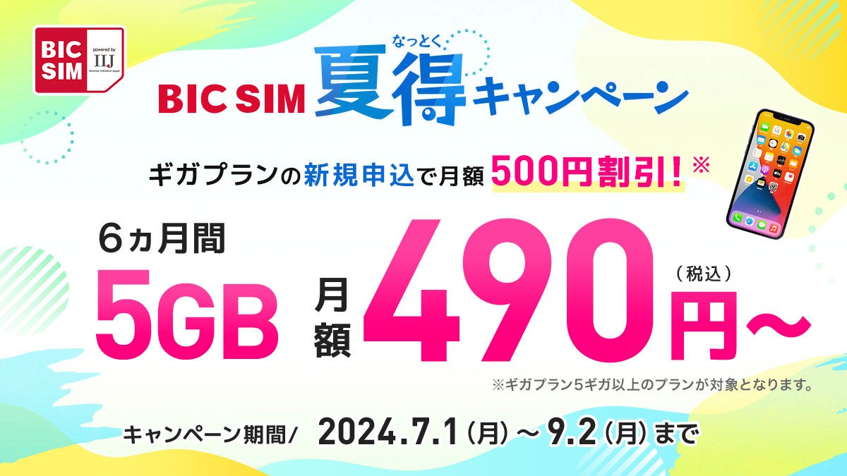 Web、店舗共通のBIC SIM夏得(なっとく)キャンペーンではギガプランの月額料金を6ヵ月間500円割引、通話定額オプションの月額料金を6ヵ月間400円割引します。