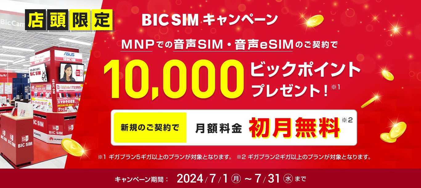 【BIC SIM】店舗申し込み限定で月額料金が初月無料、さらにビックポイントを10,000ポイント還元!