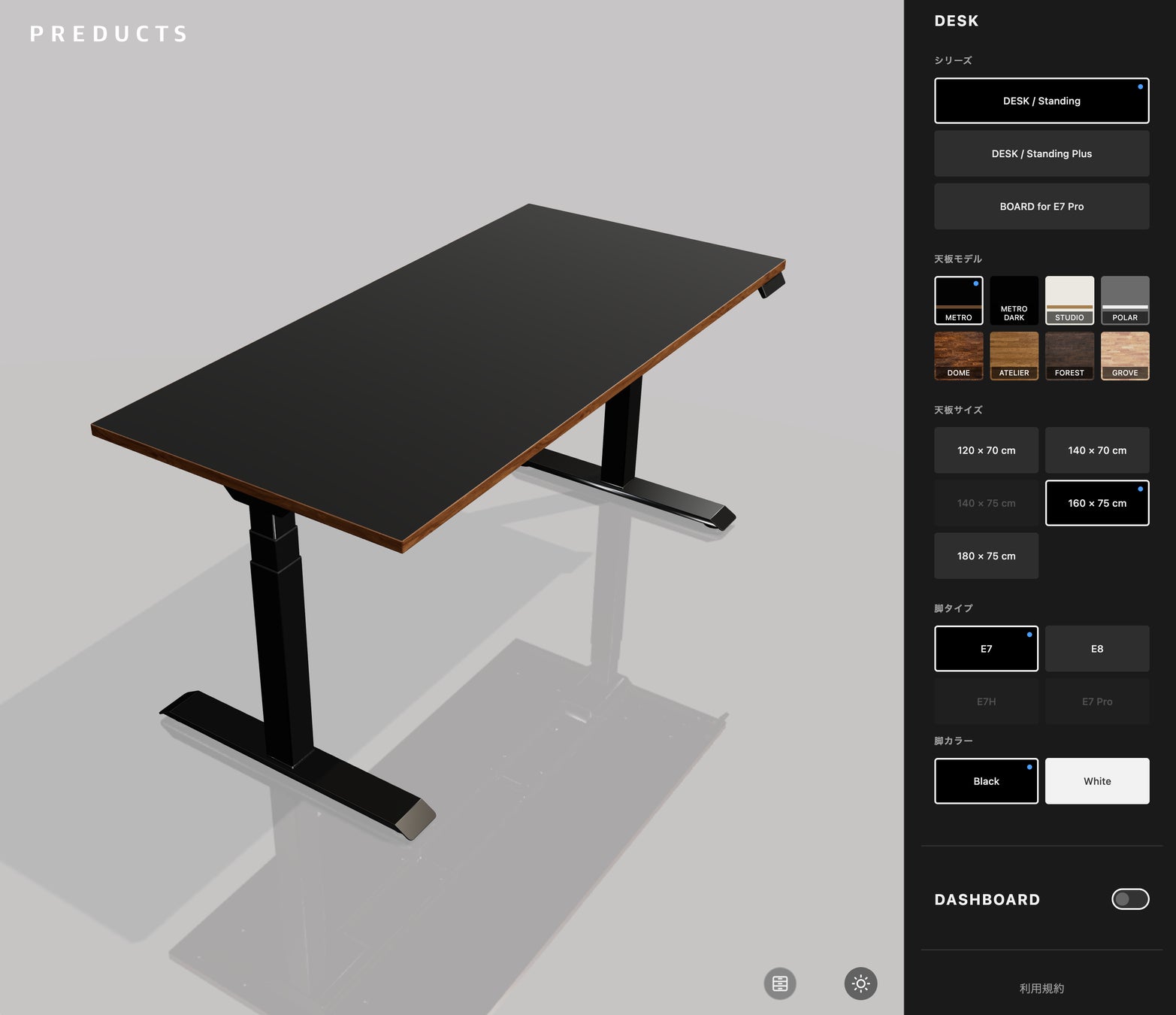 サイズは「幅120cm/140cm/160cm/180cm」の4種類、モデルは「METRO/METRO DARK/POLAR/STUDIO/DOME/ATELIER/FOREST/GROVE」の8種類からお選びいただけます。シリーズごと選択できるサイズやモデルが異なります。昇降脚は白/黒の2色から選択いただけます。