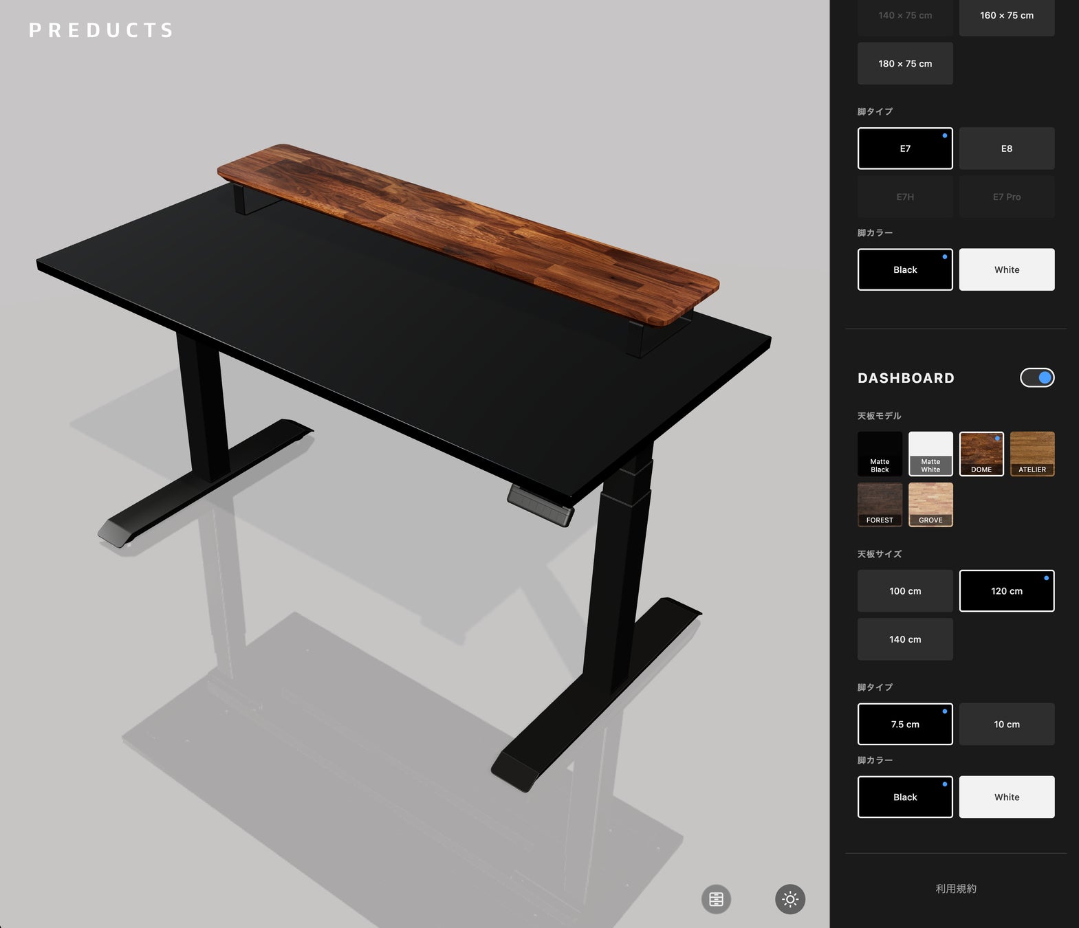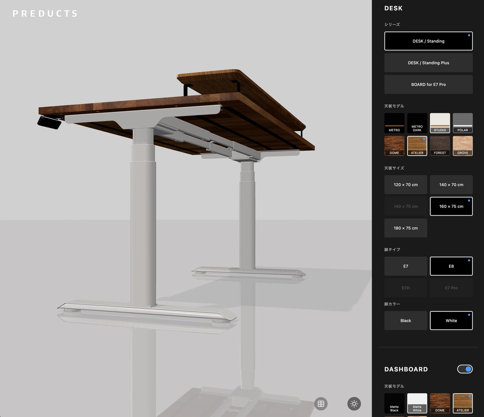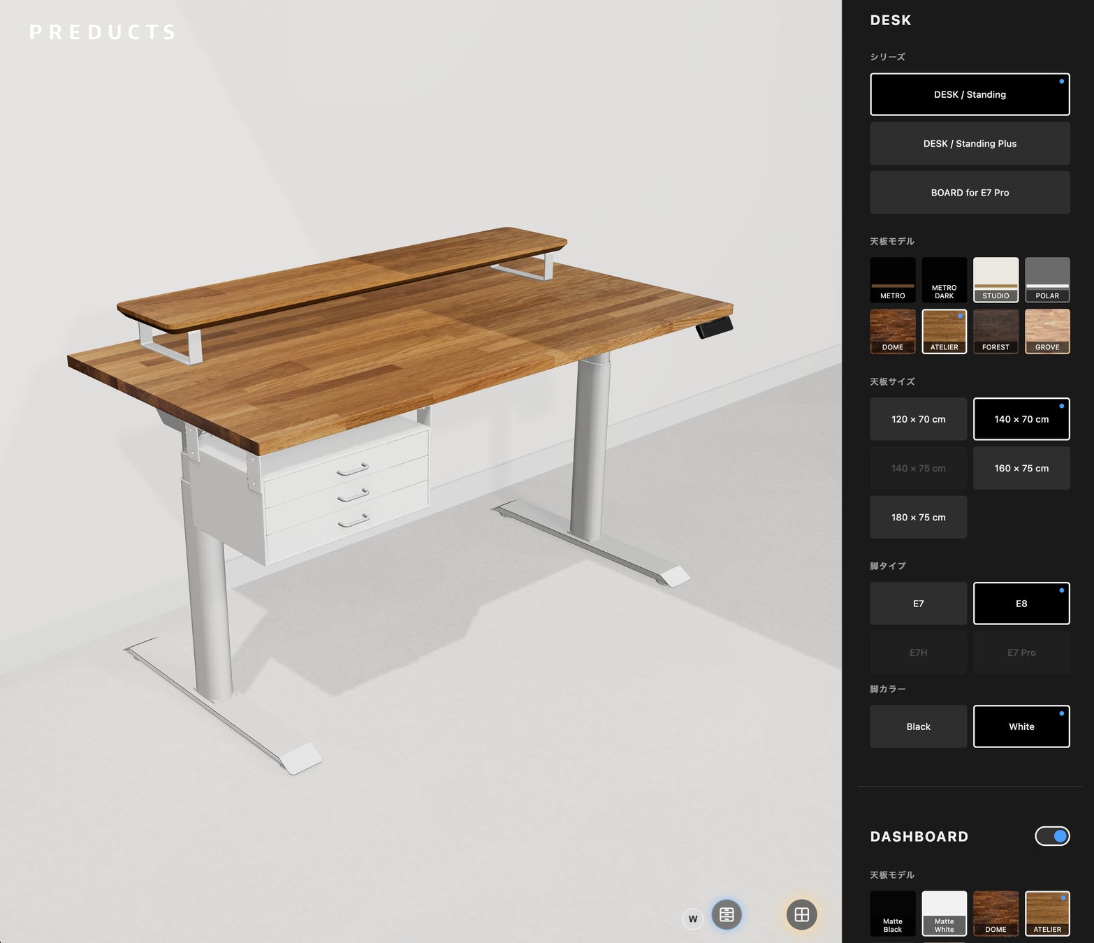DESKの上に設置する、モジュール式デスクシェルフ『DASHBOARD』の有無および、モデルやサイズも選択いただけます。