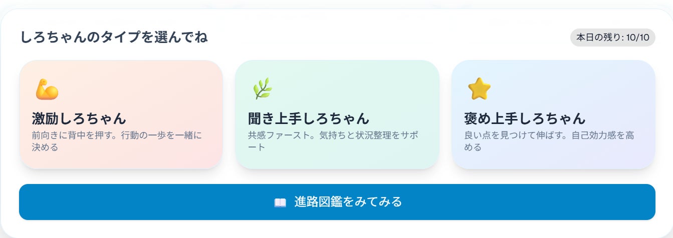 「激励しろちゃん」「聞き上手しろちゃん」「褒め上手しろちゃん」。その日の気分や、自分の性格に合わせて、一番しっくりくるしろちゃんを選べる新機能が加わりました。話しやすさも、寄り添い方も、人それぞれ。だからこそ、自分に合ったスタイルでしろちゃんと向き合えるようになりました。