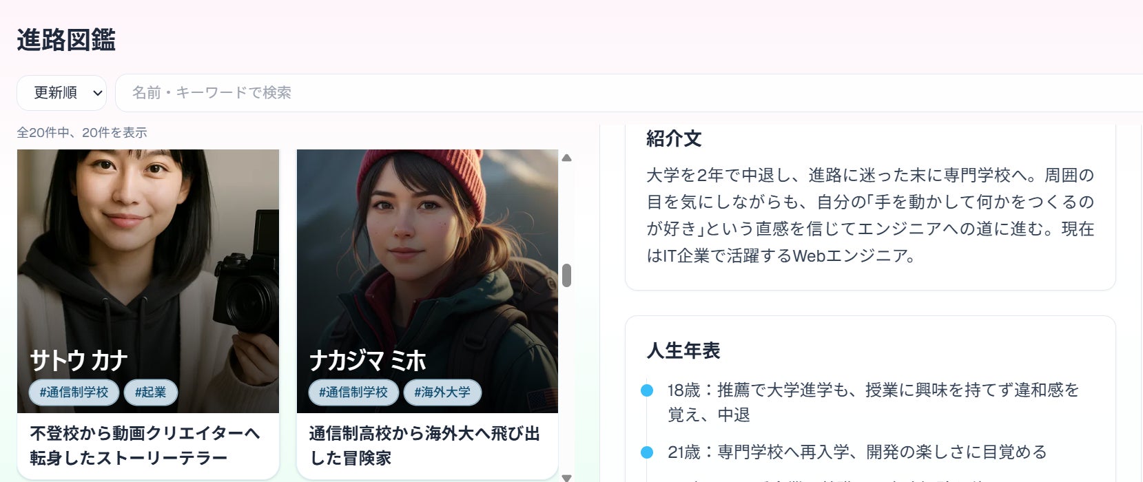 新たに追加された「進路図鑑」では、起業、専門学校、通信制学校、海外大学、ワーホリなど、さまざまな進路を選んだ“先輩”たちのリアルな生き方を一覧から探すことができます。