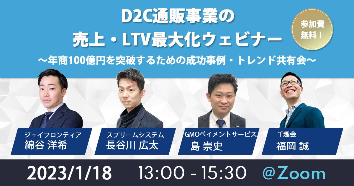 スプリームシステム株式会社(本社:東京都豊島区、代表取締役社長兼CEO:渡部 知博)は、2023年1月18日(水) 13時から株式会社ジェイフロンティア(本社:東京都渋谷区、代表取締役社長執行役員:中村篤弘)が主催する「D2C通販事業の売上・LTV最大化ウェビナー」と題した無料オンラインセミナーに登壇いたします。