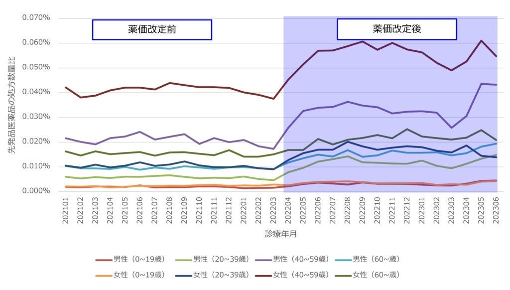 【先発医薬品の性年代別の診療年月別薬剤処方数量比】