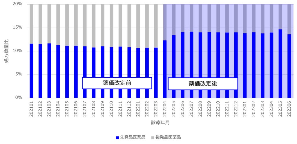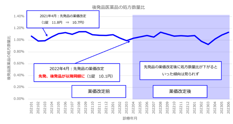 2021年4月に薬価が11.8円から10.7円に引き下げられたとき(-1.1円)は処方数量比に変動がほとんど見られませんが、2022年4月の10.7円から 10.1円への引き下げ時(-0.6円)に大きく処方数量比が増加しています。薬価引き下げの値段ではなく、後発医薬品と同額になることが処方数量比の増大のトリガーとして影響すると考えられます。