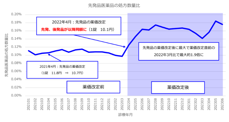 【先発薬の処方量が最大1.9倍、後発薬も処方量下がらず】先発薬とジェネリックの薬価が同等となったときの影響を調査