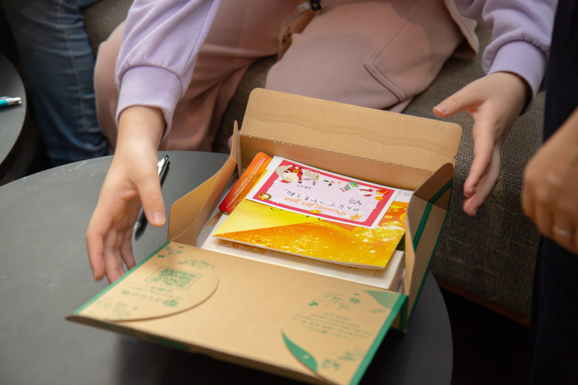 梱包体験では、商品や冊子、メッセージカードなどを一つひとつ手に取りながら、箱に丁寧に詰めていきました。