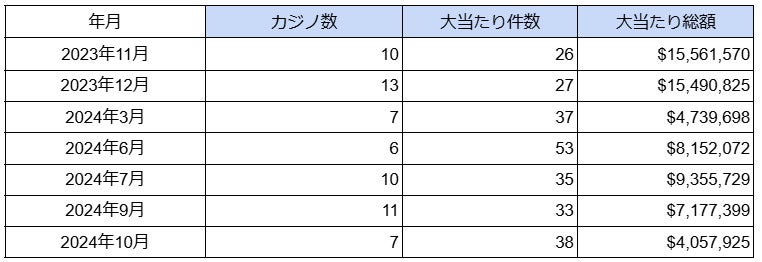 2024年10月時点での海外カジノごとの大当たり件数と総額