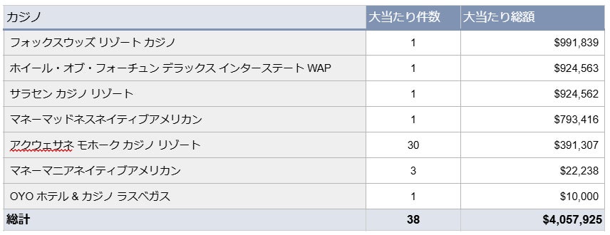 調査期間における大当たり最高額は「フォックスウッズ リゾート カジノ 」で991,839ドルで、次いで「ホイール・オブ・フォーチュン デラックス インターステート WAP」の924,563ドルとなりました。