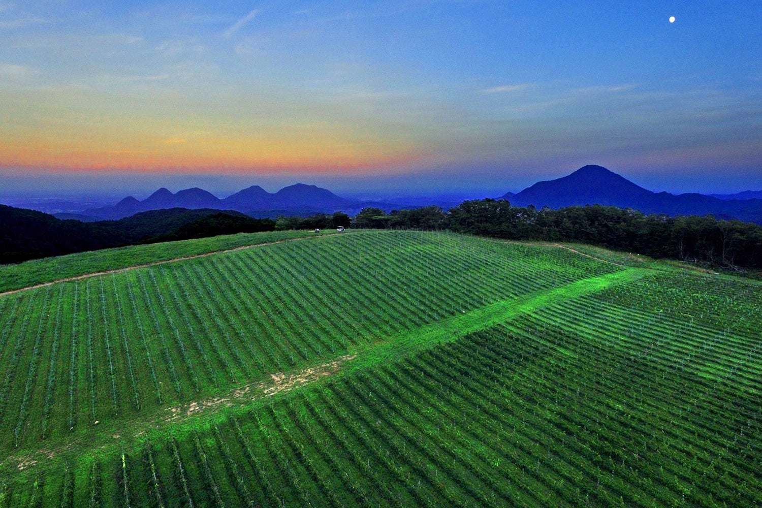 了美ヴィンヤード&ワイナリーは、宮城県黒川郡大和町吉田地区にあるなだらかな丘の上に2017年にオープン。赤崩山のふもとに位置する牧草地採取の跡地を利用して、2016年からぶどう畑に定植を開始。2017年には醸造所を整備して自社醸造を開始、2020年にレストラン「了美 wine & dine」と宿泊棟「Retreat了美七ツ森」をオープンしました。晴れた日には七ツ森の山々や遠く広がる仙台平野まで見渡せる眺望、そして船形山系と泉ヶ岳が交差する山の稜線には四季折々の表情を一年中楽しんでいただけます。仙台から車で1時間弱程で、まるで異国を思わせる自然豊かな風景が広がっているのが魅力です。現在、日本ワインを40,000本製造しています。