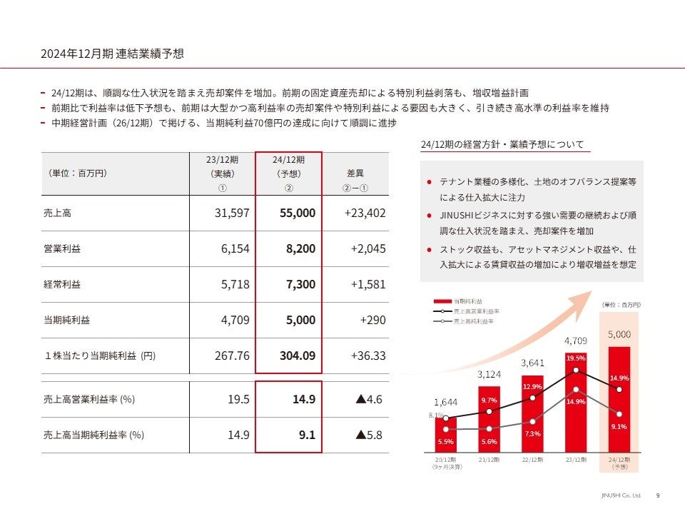順調な仕入状況を踏まえ、2024年12月期は、売却案件の増加により、増収増益となる予想です。利益率についても、引き続き高い水準を維持する見込みです。