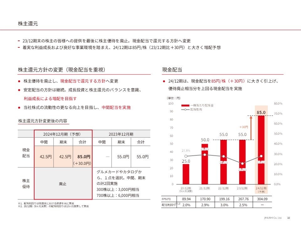 2023年12月期末の株主の皆様への提供を最後に、株主優待制度を廃止し、株主還元を現金配当に集約する方針といたしました。併せて、中間配当を実施いたします。着実な利益成長や良好な事業環境を踏まえ、2024年12月期の年間配当金は85円/株(2023年12月期比+30円/株)を予想しております。