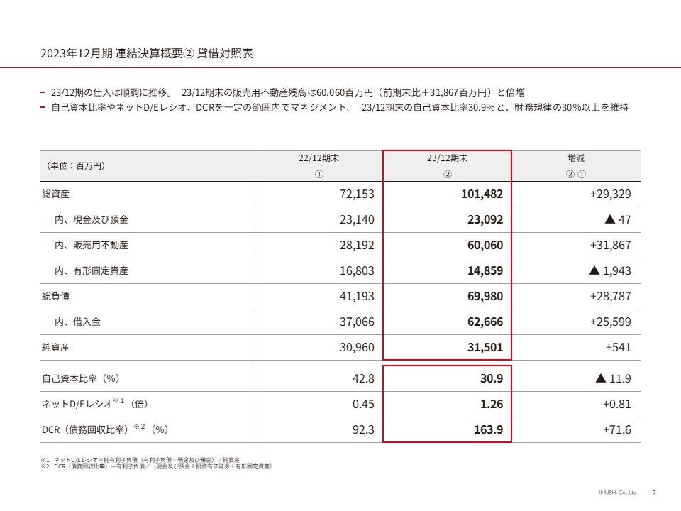 2023年12月期は、過去最高の年間仕入契約件数(83件/前期比+50件)となり、期末時点の販売用不動産残高は60,060百万円(前期末比+31,867百万円)と倍増いたしました。