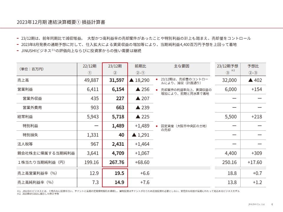 2023年12月期は、大型かつ高利益率の売却案件があったことや特別利益の計上を踏まえ、販売用不動産の売却量をコントロールし、計画通り減収増益となりました。好調な仕入れによって賃貸収益が増加した結果、当期純利益は4,709百万円と、2023年8月に公表した連結業績予想4,400百万円を上回って着地しております。