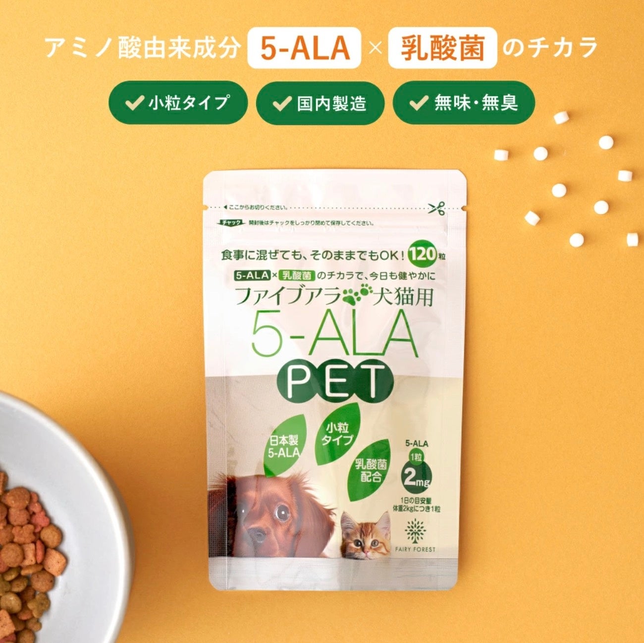本商品は、ペットの活力維持をサポートする「5-ALA(5-アミノレブリン酸)」と、内側 からの環境を整える「乳酸菌」を配合した新発想のペットサプリメントです。 製造面においては、厳格な品質管理のもと、国内の GMP 認定工場にて一つひとつ丁寧に 仕上げています。