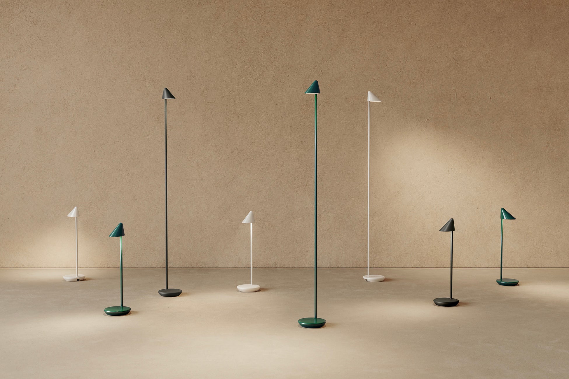 ラインナップは、タイムレスなシルエットのデスクライトと、H1100mmのスタンドライトの2種をご用意しました。スタンドはソファの背面に置けば読書する手元だけを、ダイニングテーブル脇では卓の中心だけをそっと照らし、会話と余白を生む環境を整えます。どちらも軽やかに持ち運べるポータブル設計で、周囲の輝度を整え、 デジタルデバイスとも静かに調和します。カラーパレットは絹のような白、 鋳肌を思わせるマットブラック、鮮やかなグリーンの3色を展開。それぞれに、精密な工業技術にクラフトの質感が息づく独自の仕上げを施しました。