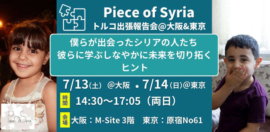 NPO法人Piece of Syria、トルコで暮らすシリア人の今を伝えるイベント「 【トルコ出張報告会】僕らが出会ったシリアの人たち 彼らに学ぶしなやかな未来を切り拓くヒント」を7/13・14に開催