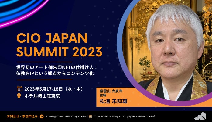 マーカス・エバンズ・イベント・ジャパン・リミテッド(本社:英国 / 日本代表:雪下 大輔、以下「マーカスエバンズ」)が主催するIT部門のビジネスサミット『CIO Japan Summit 2023』に、世界初アート御朱印NFTを仕掛けた紫雲山 大泉寺の松浦 未知雄氏の登壇が決定したことをお知らせします。