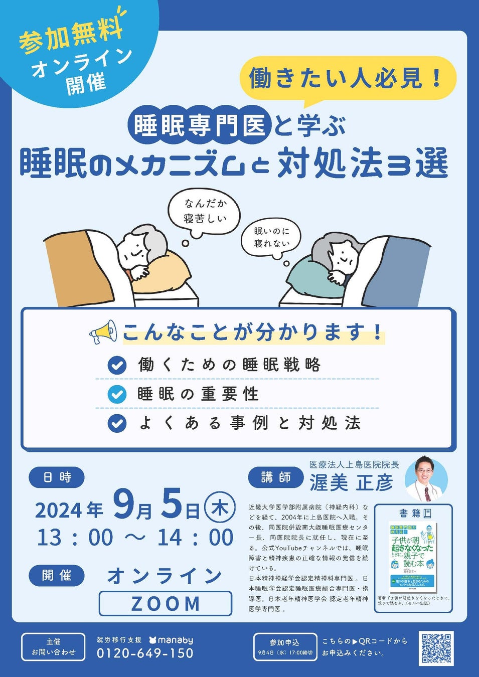 就労⽀援事業を⾏う株式会社manaby(本社:宮城県仙台市、代表取締役社⻑:岡﨑 衛)は、無料オンラインセミナー「睡眠専門医と学ぶ 睡眠のメカニズムと対処法3選」を開催します。