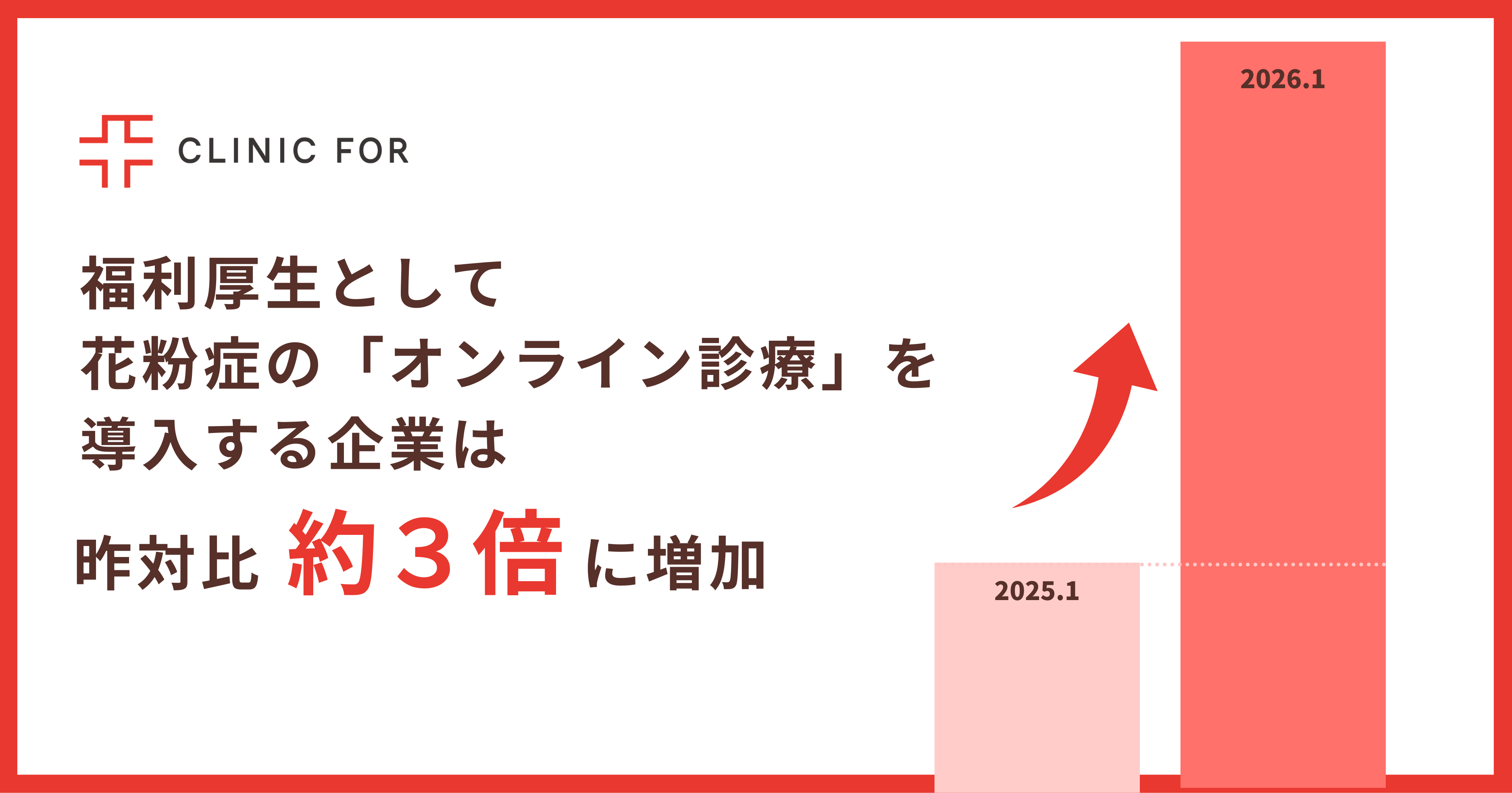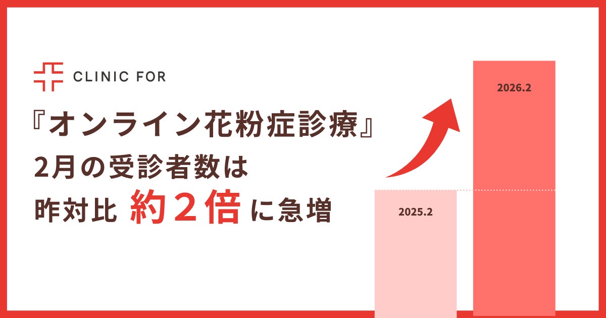 対面診療とオンライン診療を提供するクリニックフォアグループ(以下、クリニックフォア)は、2026年のスギ花粉シーズンにおけるオンライン診療の受診動向について速報でお知らせします。「オンライン花粉症診療」(※1)は、2026年2月の受診数が昨対比約2倍に急増(※2)しました。一部エリアでは例年以上の花粉量増加が見込まれる中、さらなる受診数の増加が予想されます。