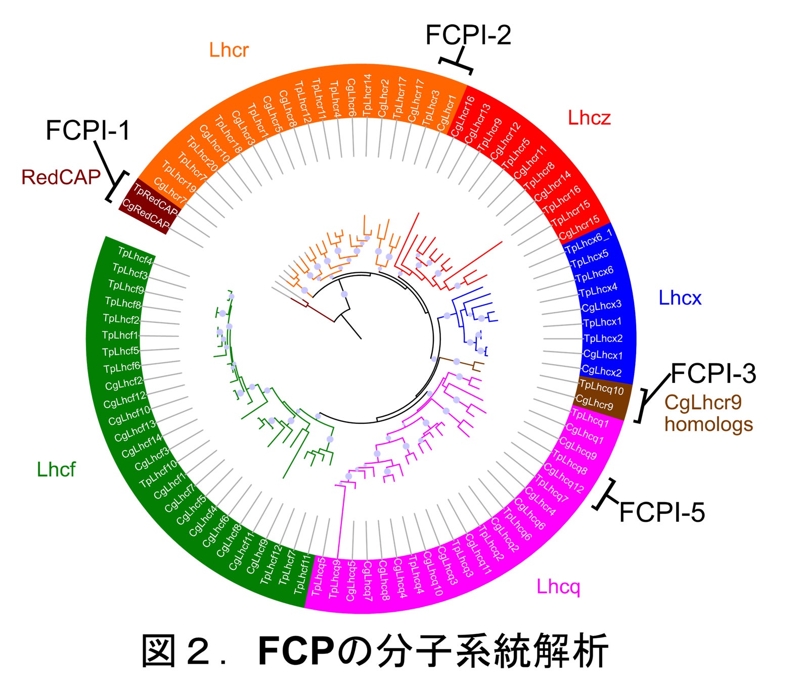 珪藻C. gracilisではPSI-FCPI構造が解かれています。二種類の珪藻のPSI-FCPI構造を重ね合わせ、FCPI-1からFCPI-5までを比較しました。その結果、FCPIとPSIとのタンパク質間相互作用が両種で高度に保存されていました。さらに、FCPの分子系統解析の結果、T. pseudonanaのRedCAP(TpRedCAP)、TpLhcr3、TpLhcq10、TpLhcq8が、C. gracilisのRedCAP(CgRedCAP)、CgLhcr1、CgLhcr9、CgLhcq12のそれぞれとオーソログ関係にあることを見出しました(図2)。