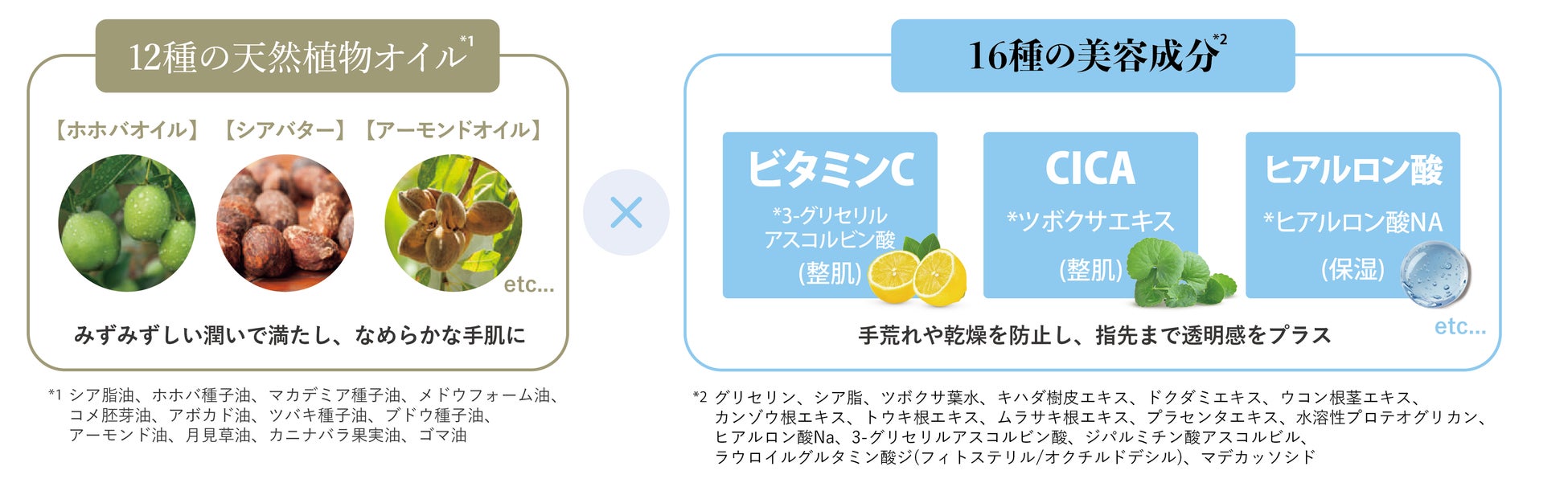 プロミルオイルにも含まれるホホバオイル*3・シアバター*4・アーモンドオイル*5など12種類の天然由来成分に加え、手肌のキメを整えるビタミンC*6・肌荒れを防ぐCICA*7・高い保湿効果をもつヒアルロン酸*8 など16種類の美容成分を配合。手荒れや乾燥を防ぎ、潤いに満ちたなめらかな手肌に導きます。さらに6つのフリー処方(アルコールフリー、ミネラルオイルフリー、合成着色料フリー、合成界面活性剤フリー、酸化亜鉛フリー、サルフェートフリー)で、お肌への優しさも追求しました。