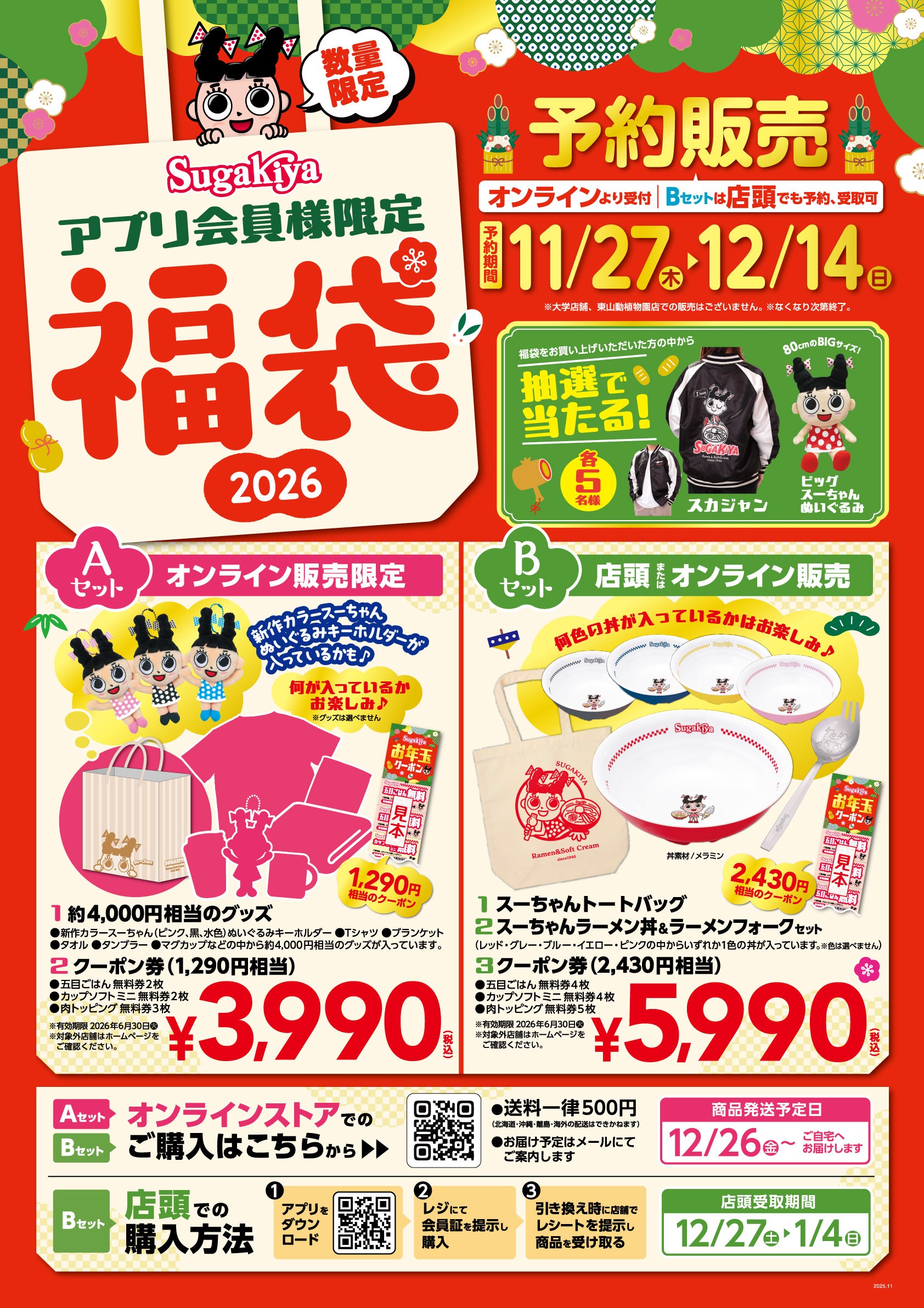 さらに今年は、福袋をご購入いただいた方の中から、抽選でスガキヤグッズの冬の新商品「スカジャン」、「ビッグスーちゃんぬいぐるみ」が当たるキャンペーンも開催いたします。