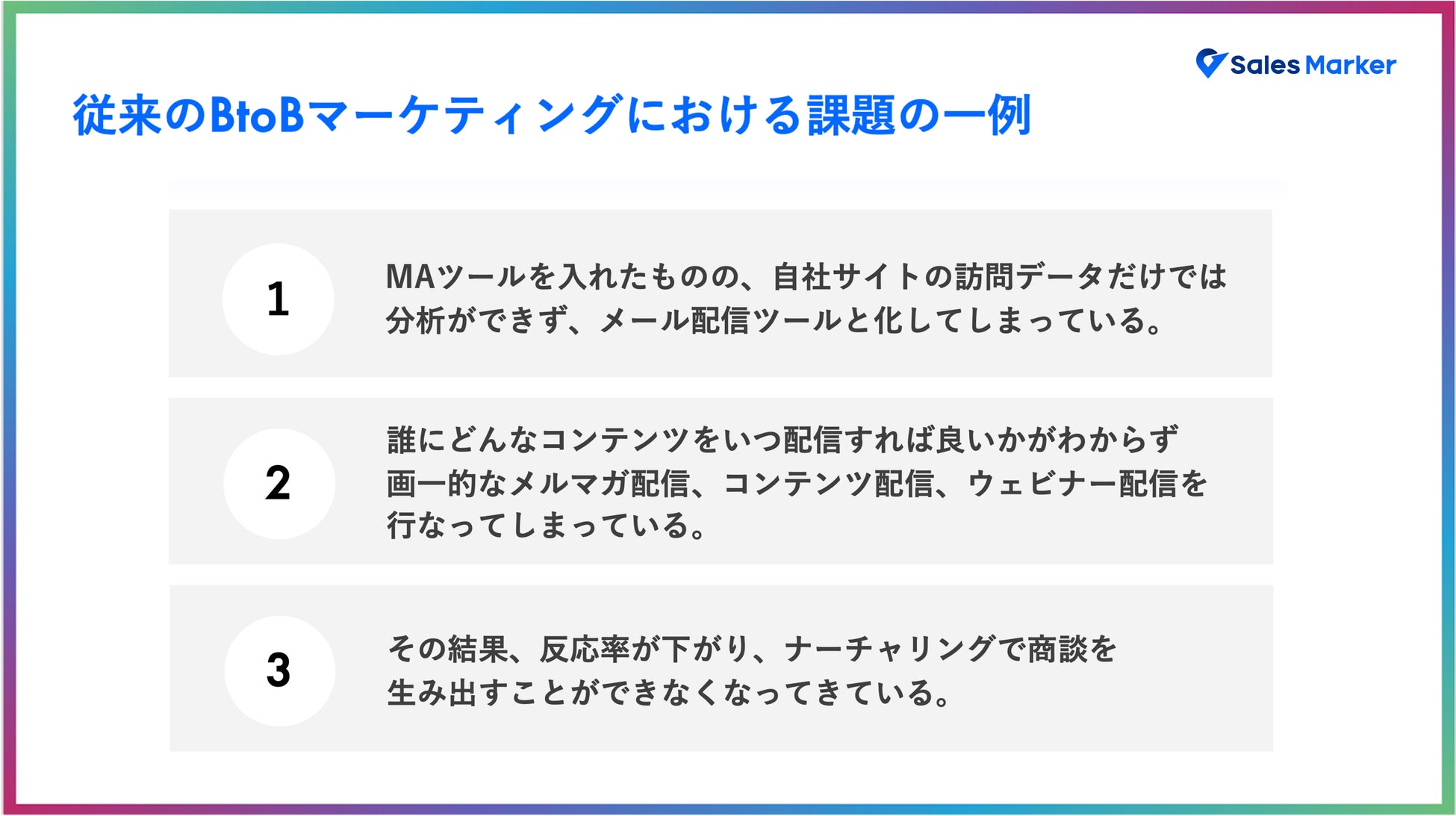 このようなアプローチ方法は顧客のニーズに寄り添っていないため、アポイントや受注に繋がる確率はごくわずかで、ツールを入れたものの成果が上がらないといった課題が浮き彫りになってきました。