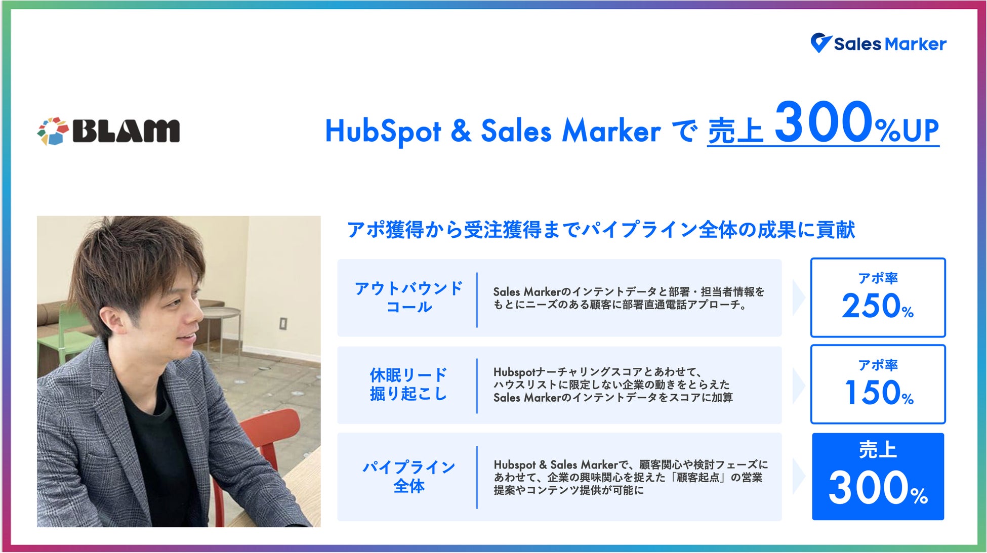 今回の業務提携に先駆けて、『KAIKOKU』を提供するBLAM社は、『Sales Marker』を活用したこの一連のオペレーションを自社内で実践し、売上300%アップなど目覚ましい成果をあげています。