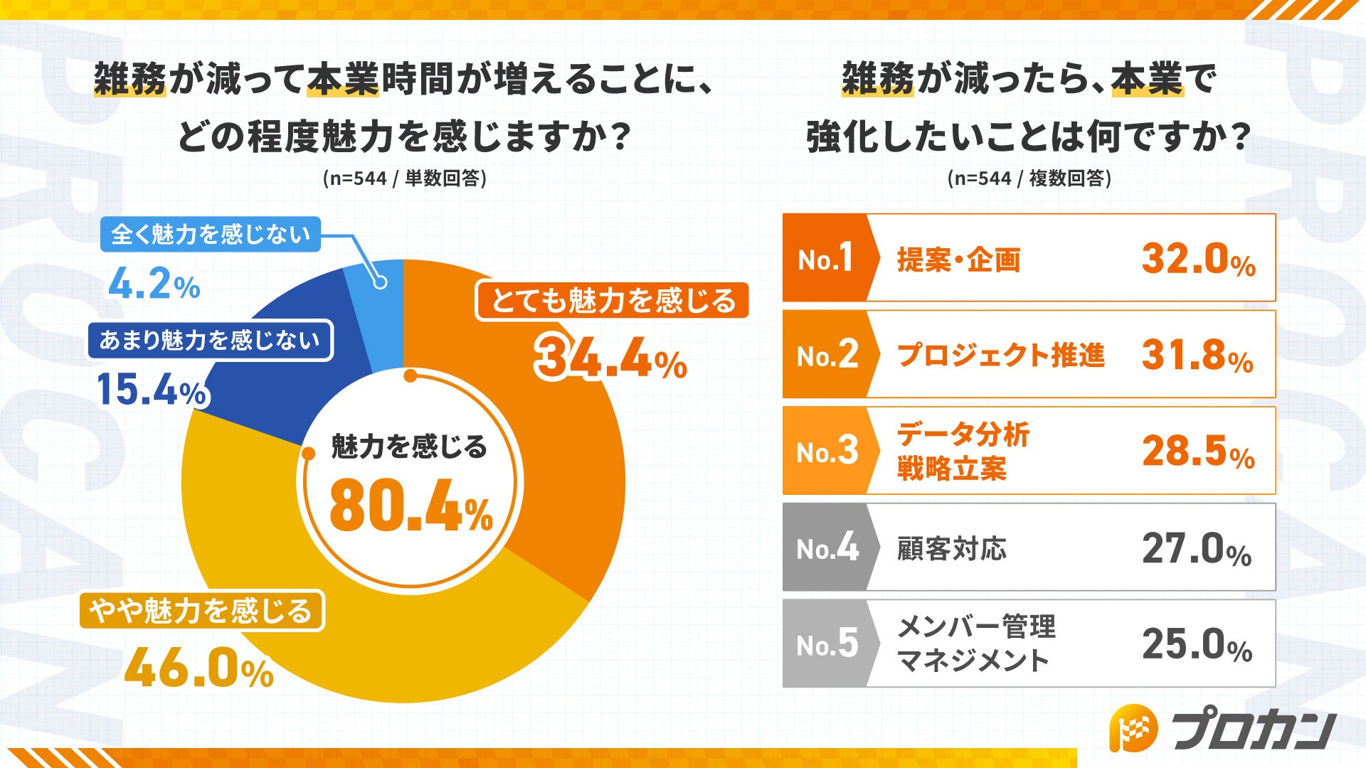雑務が減って本業時間が増えることに魅力を感じるかたずねたところ、8割以上が「雑務削減に魅力を感じる」と回答。削減で得られた時間で強化したい業務は「提案・企画(32.0%)」「プロジェクト推進(31.8%)」「データ分析・戦略立案(28.5%)」など、“攻めの本業”が中心でした。